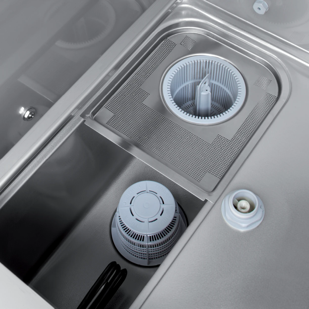 Rezervoar za pranje je potpuno pokriven iznad mesta za sredstvo za pranje površinskim filterom od nerđajućeg čelika. Dva dodatna filtera su postavljena ispred ulaza pumpe kako bi se osigurao kontinuirani tretman vode i pouzdano zaštitile komponente.