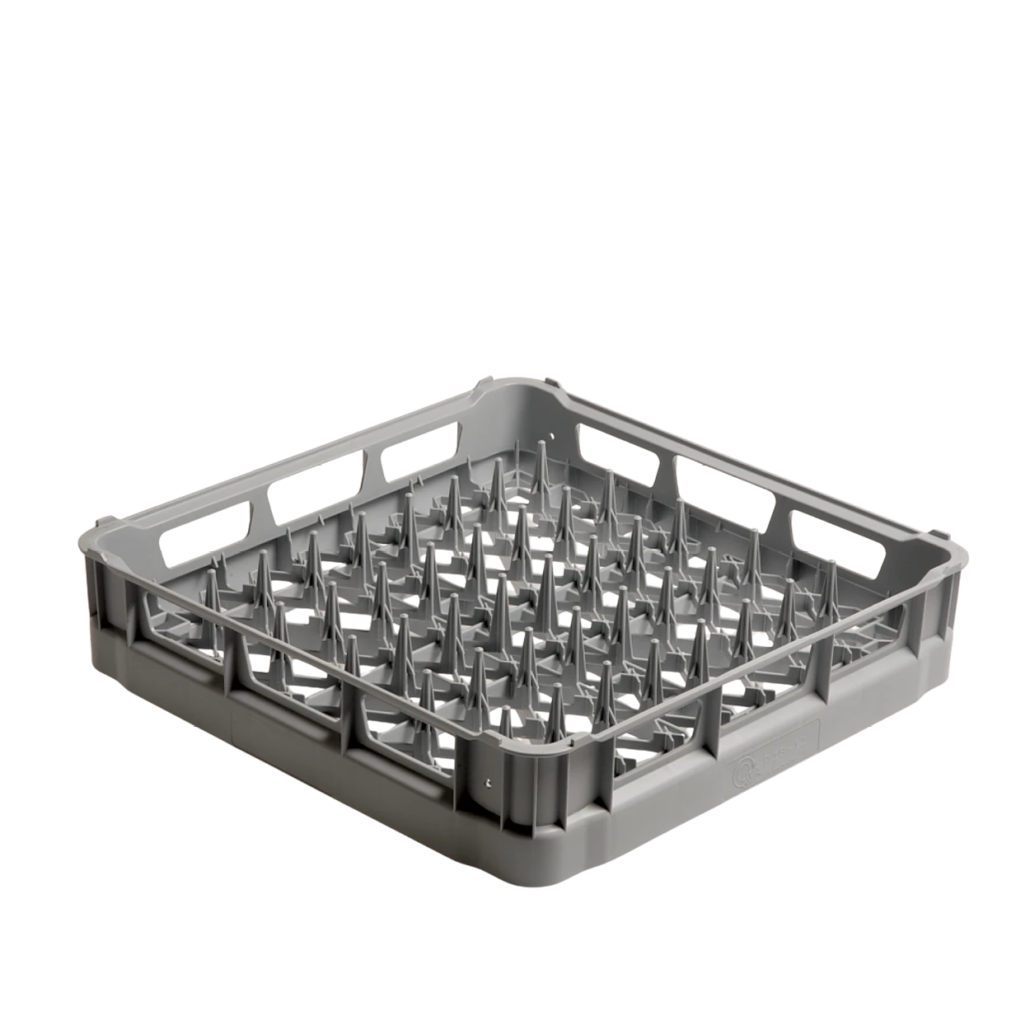 Plastični stalak za tanjire sa spoljašnjim dimenzijama 500 x 500 x 100 mm (Š × D × V) pruža sigurno i praktično rešenje za pranje i odlaganje tanjira.