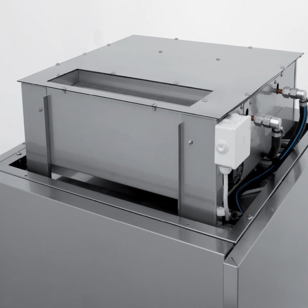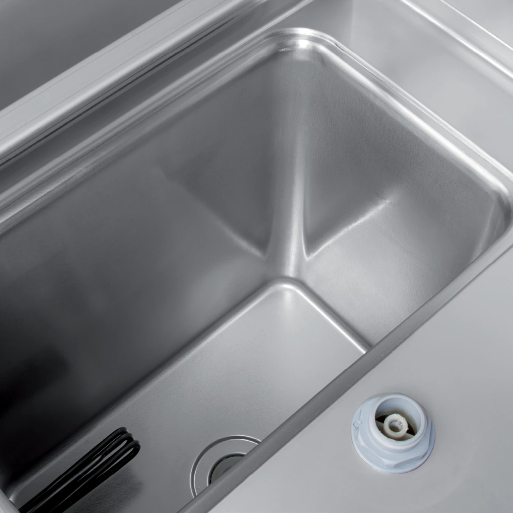 Unutrašnjost je izrađena tehnikom dubokog izvlačenja, sa integrisanim nosačima za rešetke u bočnim zidovima, i potpuno je bez cevi i oštrih ivica, što obezbeđuje besprekornu higijenu.