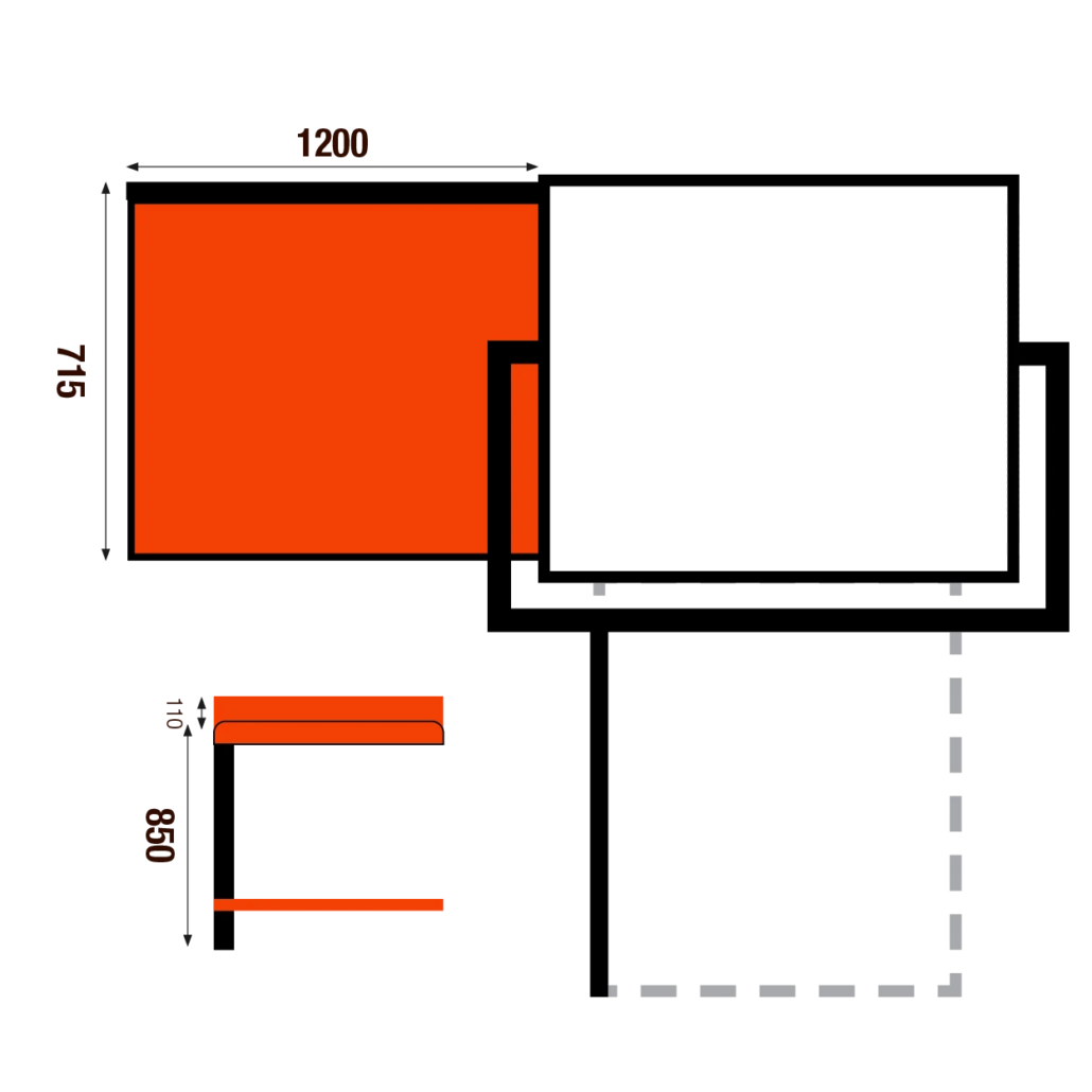 Nagnuta radna površina, zakošena prema mašini, izrađena je od nerđajućeg čelika debljine 1,0 mm (CrNi 18/10) i čvrsto je pričvršćena za osnovni ram, koji je konstruisan od kvadratnih cevi dimenzija 40 x 40 mm. Pored toga, postavljena je međupolica visine 30 mm na visini od 170,5 mm. Ova polica je direktno povezana sa nosačem koji se isporučuje uz mašinu, čime se obezbeđuje dodatna stabilnost i prostor za odlaganje.