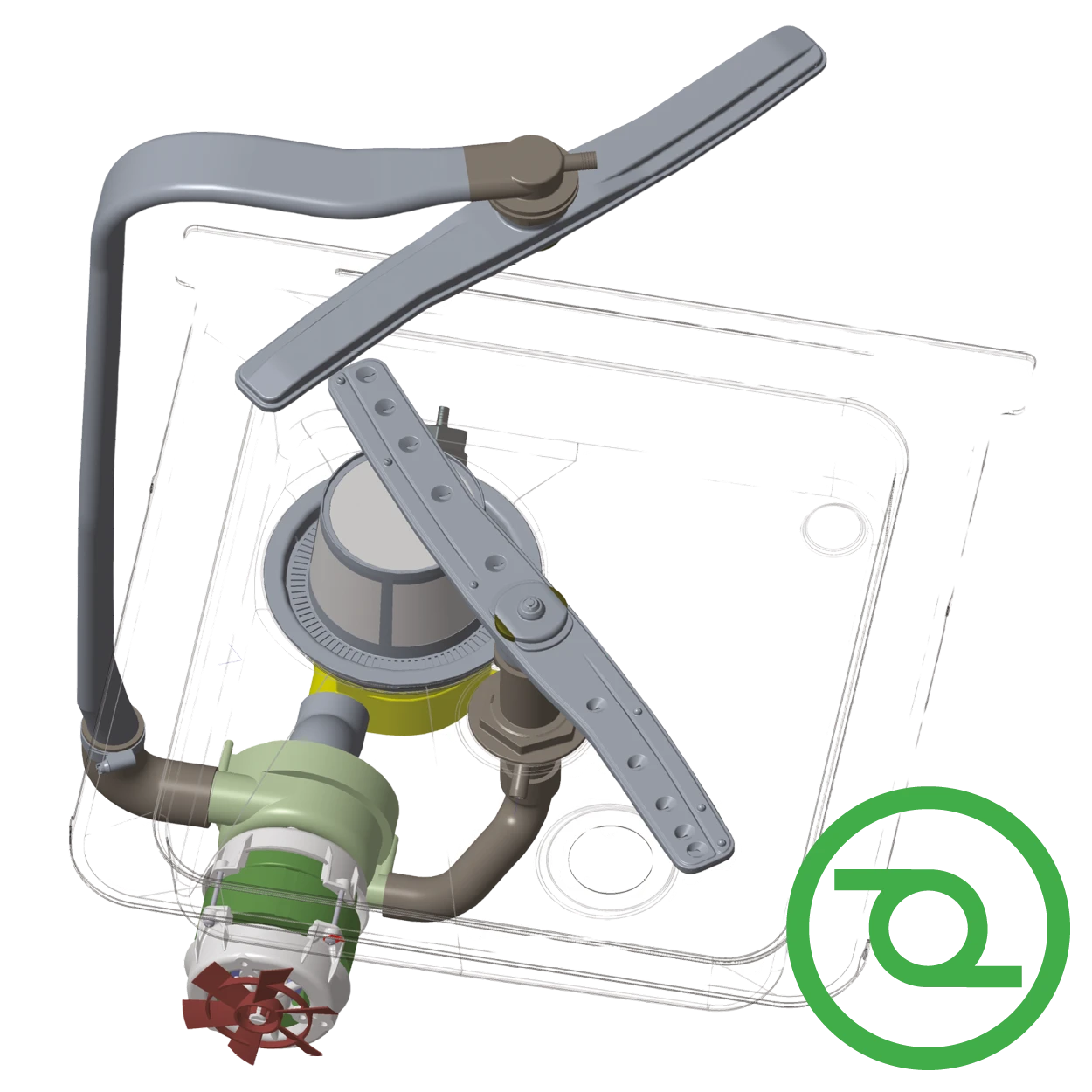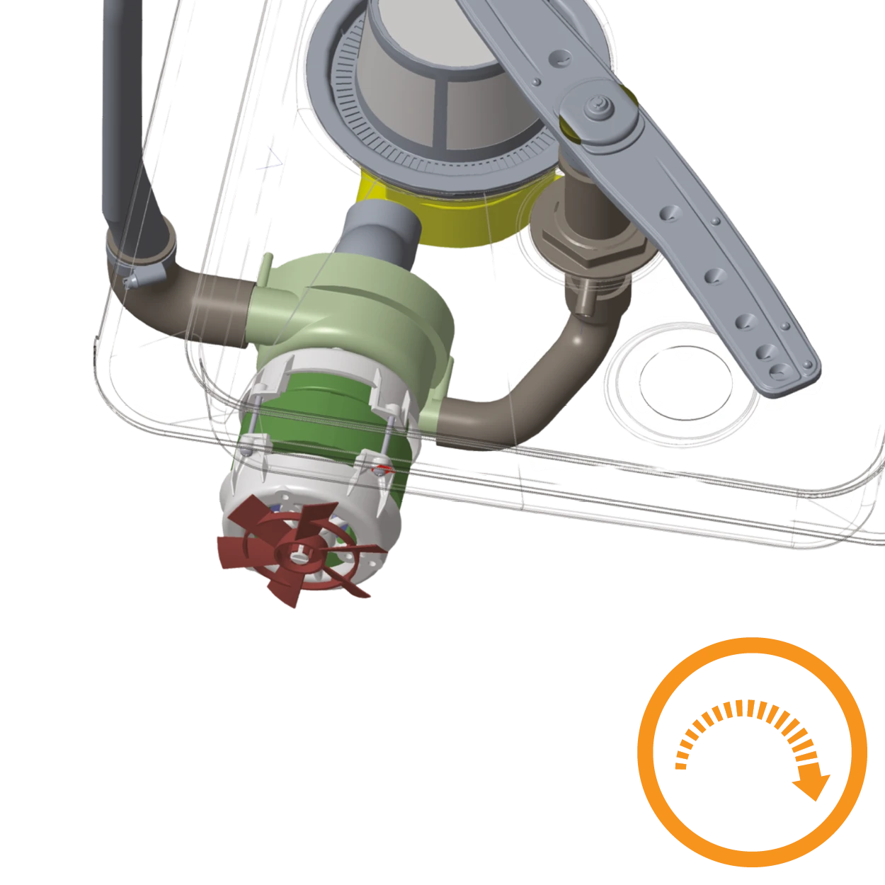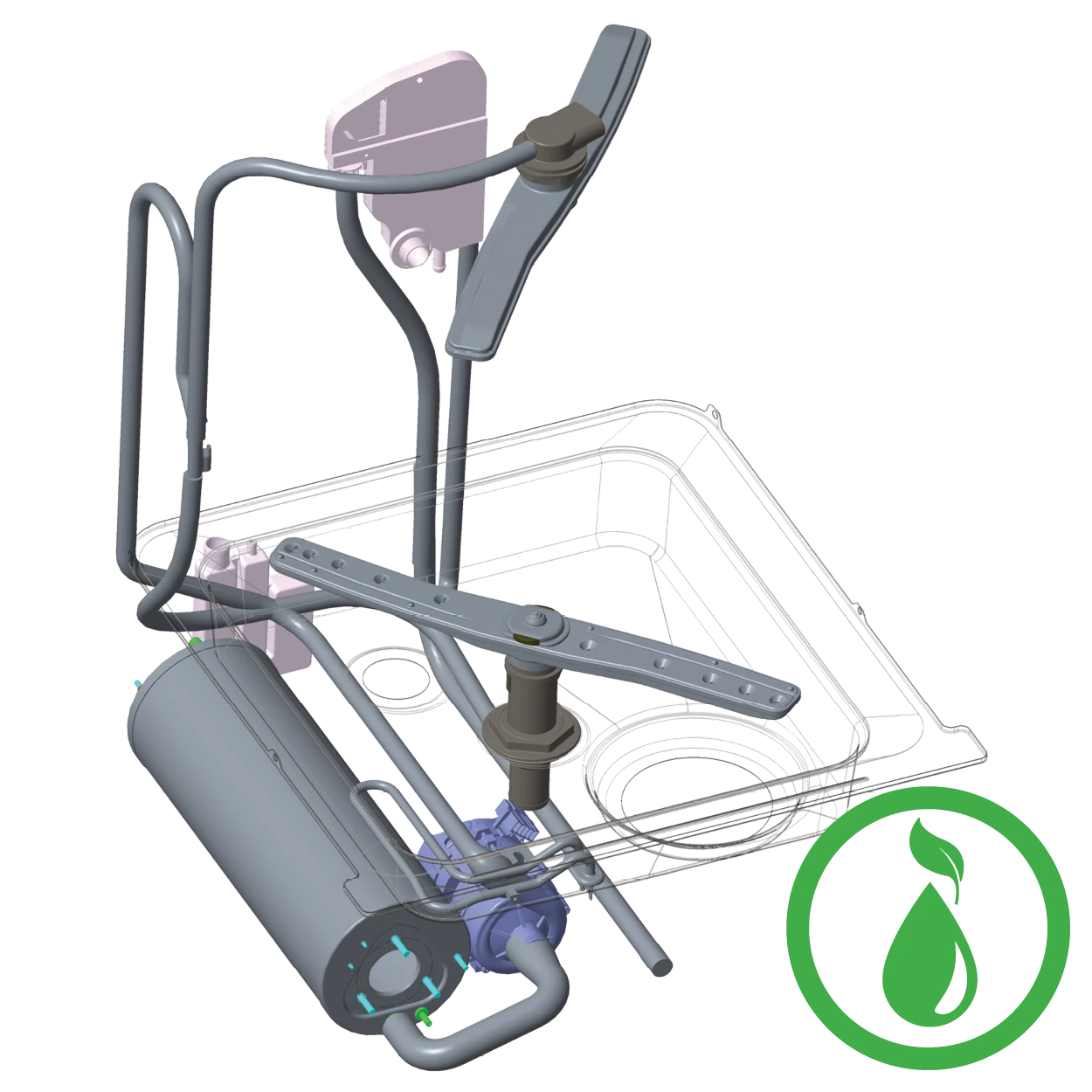 DuoFlow (pumpa za pranje)Patentirani sistem pumpe DuoFlow koristi jedan ulaz i dva izlaza za istovremeni rad prskalice za pranje.Konvencionalni sistemi dele protok vode pomoću T- ili Y-spoja, što rezultira gubitkom performansi od 25–30%.Sa optimizovanom dinamikom protoka, DuoFlow osigurava da nema gubitka pritiska i smanjuje nivo buke za 3 dB.Pumpa pruža pune performanse sa samo 700 W umesto 1.000 W, smanjujući potrošnju energije za oko 5%.DuoFlow tehnologija poboljšava efikasnost procesa pranja, a istovremeno pomaže u smanjenju troškova rada.