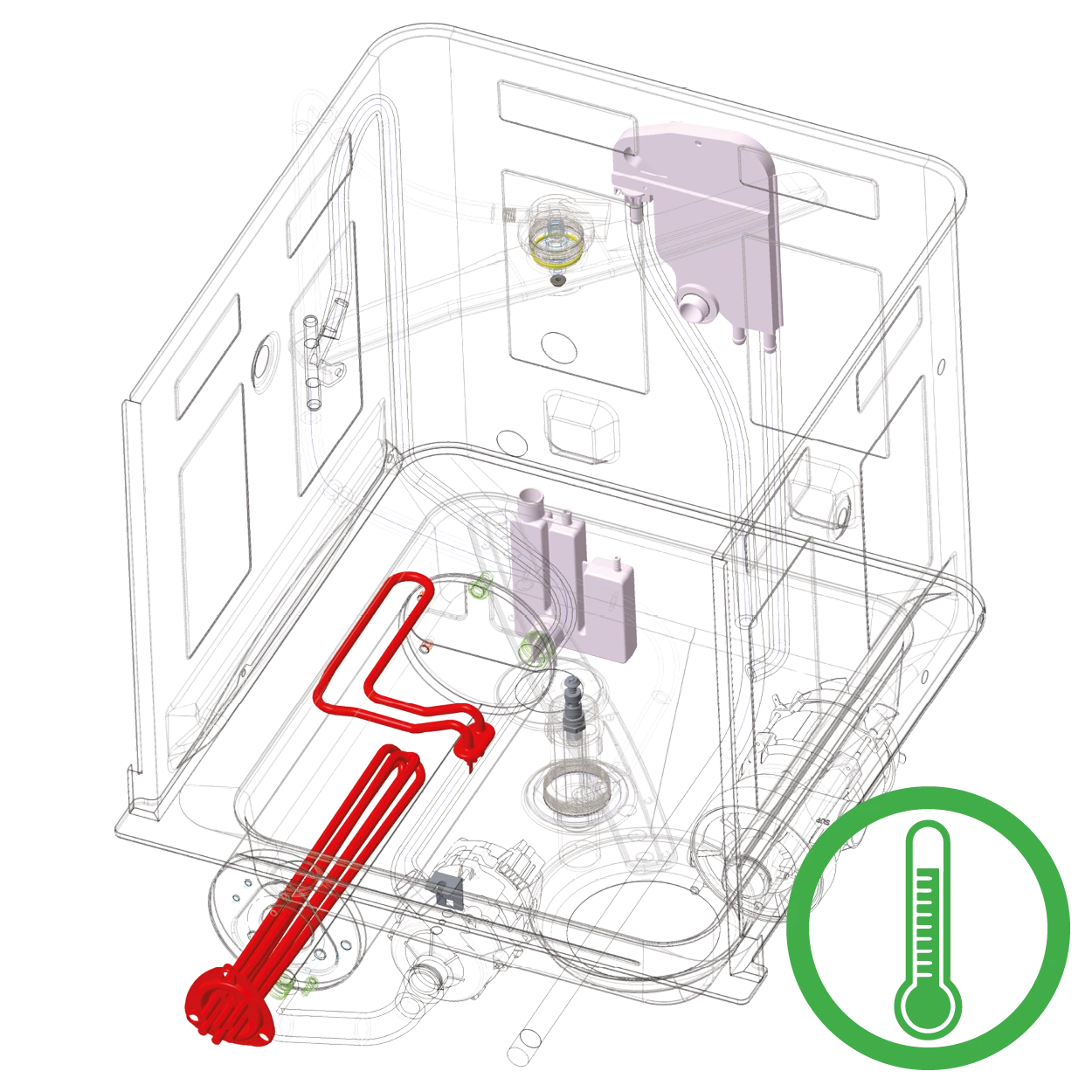 HotWash (sistem grejanja)Sistem grejanja HotWash obezbeđuje konstantnu temperaturu rezervoara – čak i tokom čestih ciklusa pranja.Paralelno funkcionisanje grejnih elemenata i optimizovana raspodela snage omogućavaju efikasnu raspodelu raspoložive energije između grejača bojlera i rezervoara.Ovo sprečava pad temperature, skraćuje vreme ciklusa pranja i poboljšava performanse sušenja.Sistem takođe smanjuje potrošnju deterdženta i povećava ukupnu efikasnost.Integrisani termički osigurači pružaju dodatnu bezbednost i stabilnost tokom procesa grejanja.