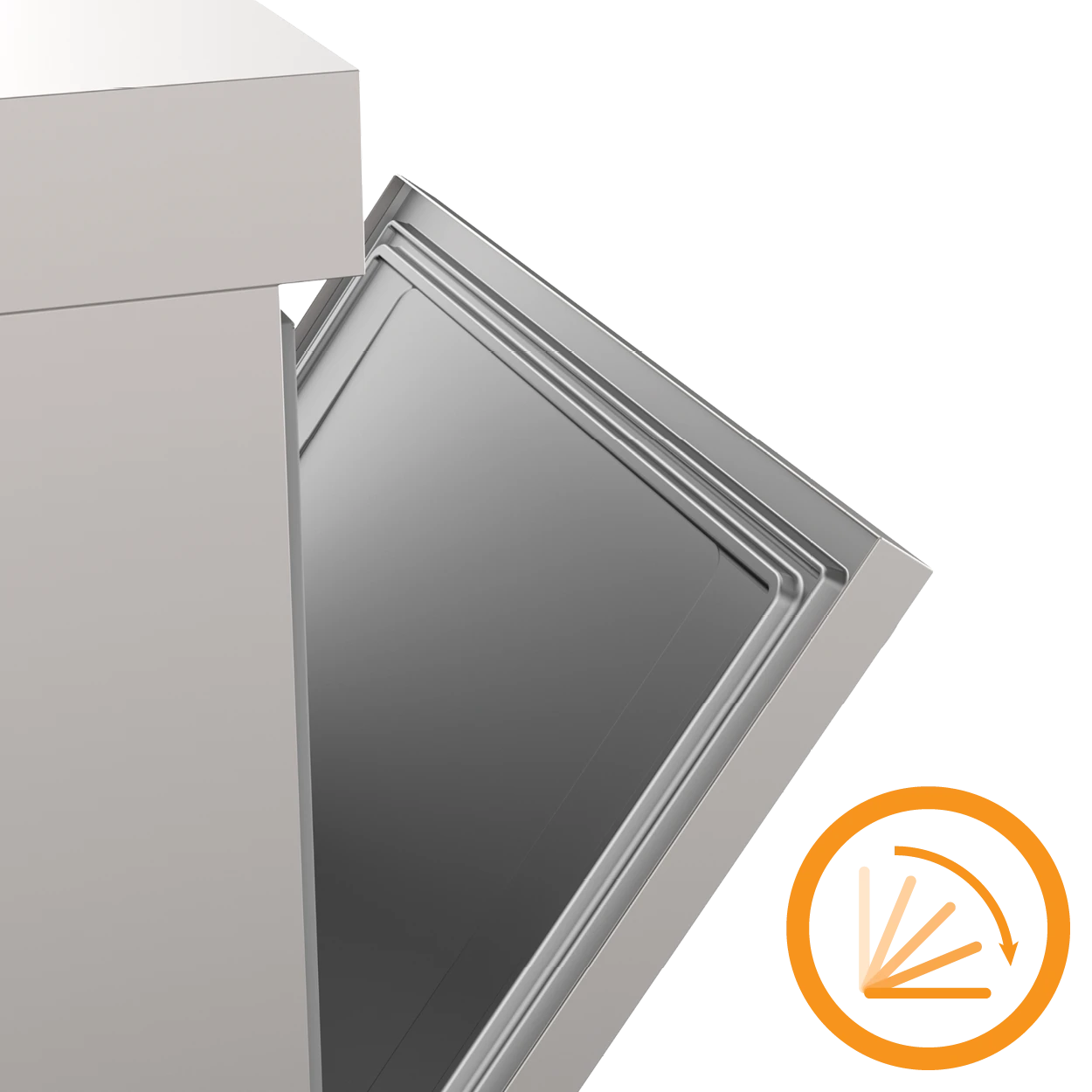 ProBalance (Otvaranje vrata)ProBalance tehnologija obezbeđuje glatko, meko kretanje vrata, sprečavajući naglo zalupljivanje i štiteći osetljivo posuđe od udaraca i oštećenja.Zahvaljujući optimizovanoj mehanici, potrebno je samo 3 kg sile za otvaranje vrata – upola manje od uobičajenog napora – što značajno poboljšava jednostavnost korišćenja.Pored toga, utisnute vođice u vratima sa dvostrukim zidovima olakšavaju umetanje korpi, smanjujući napor korisnika, povećavajući produktivnost i minimizirajući rizik od oštećenja.
