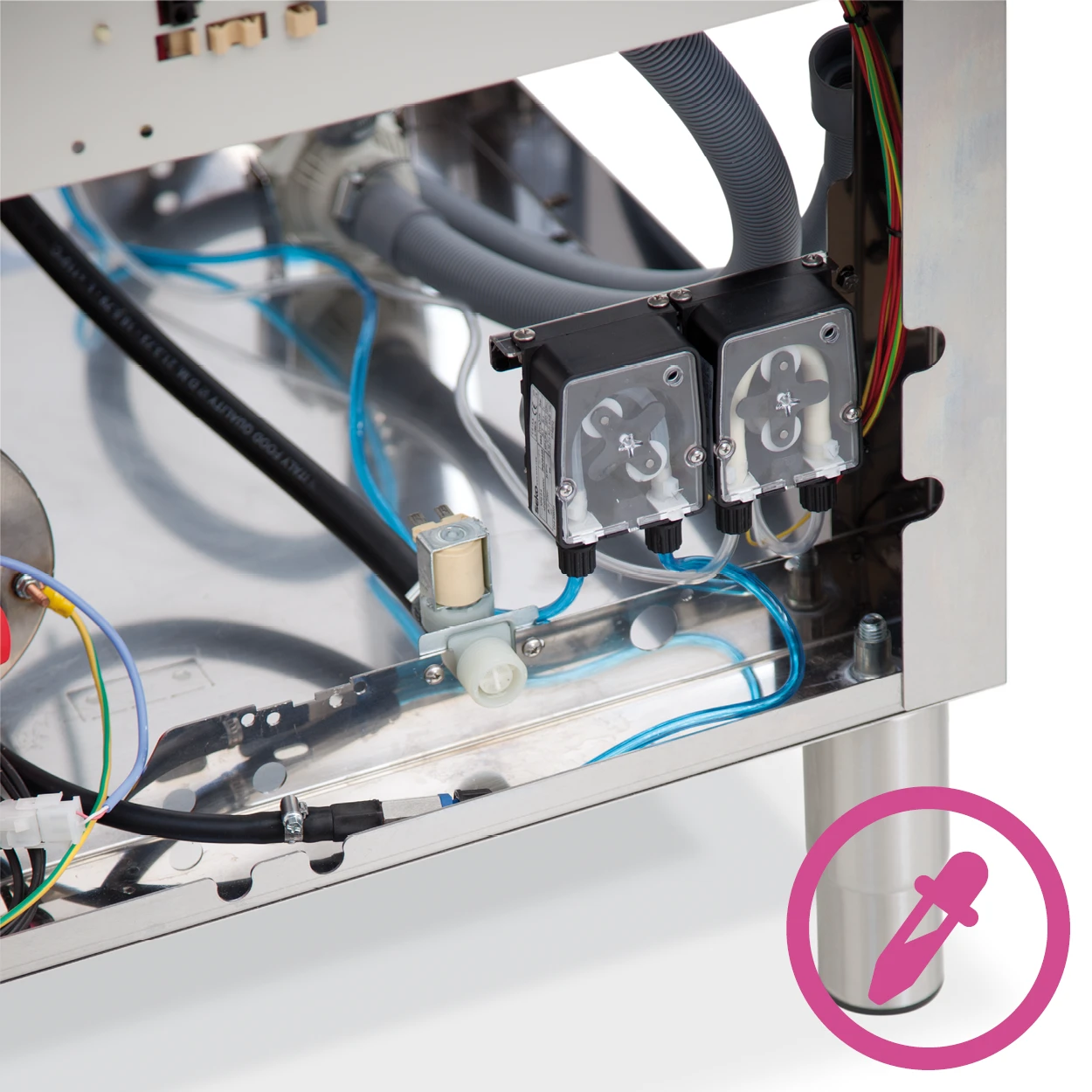 ProDose (Sistem za doziranje)ProDose jedinice omogućavaju preciznu, elektronsku kontrolu doziranja deterdženta i sredstva za sjaj posuđa direktno preko ekrana.Peristaltičke pumpe obezbeđuju precizno doziranje, dok opciona usisna creva sa senzorima nivoa sprečavaju kontaminaciju.Količina doziranja je konfigurisana različito u zavisnosti od serije mašine:Kod modela TopTech Plus i TopTech, doziranje je precizno podešeno u gramima po litru.Kod mašina IsyTech i SteelTech, doziranje je definisano u sekundama - ali se takođe može precizno pretvoriti u grame pomoću referentne tabele.