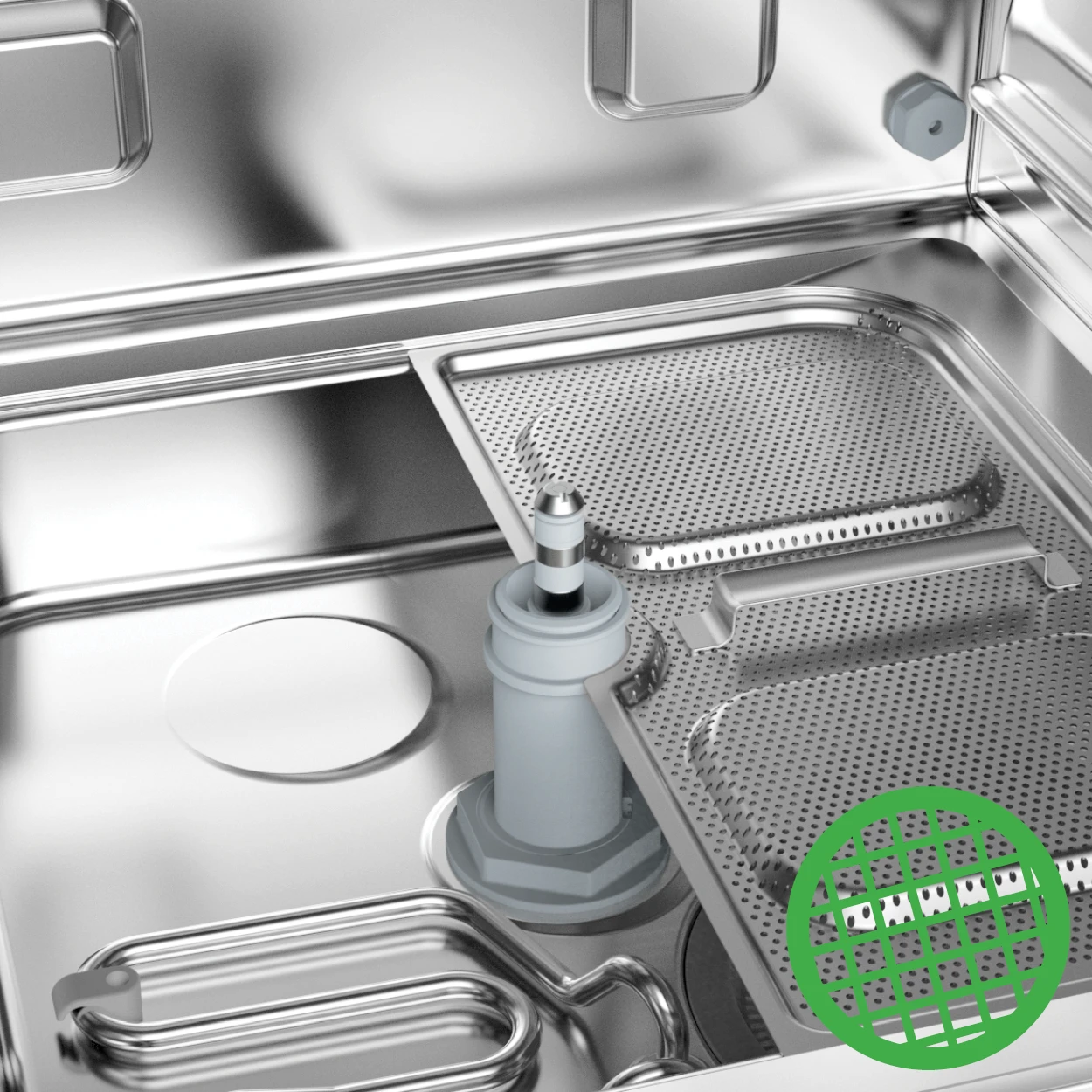ProDrain4 (sistem filtera)Sistem filtera ProDrain4 poboljšava filtraciju kroz trostepeni proces finog filtriranja dizajniran za kontinuirano čišćenje vode sa deterdžentom u mašini.Filteri od nerđajućeg čelika u rezervoaru pokrivaju ceo rezervoar i specijalno su oblikovani da spreče začepljenje – čak i kada su u pitanju tvrdokorni ostaci hrane. Sa veličinom mrežice od 1,5 mm, veoma su trajni i lako se uklanjaju.Ispod njih, pretfilter sa mrežicom od 2,5 mm zadržava krupne čestice, dok fini filter sa mrežicom od 0,5 mm osigurava da pumpa za pranje usisava samo čistu vodu.Ovaj sistem duže održava vodu za pranje čistom, smanjuje učestalost zamene vode u rezervoaru i smanjuje potrošnju deterdženta.