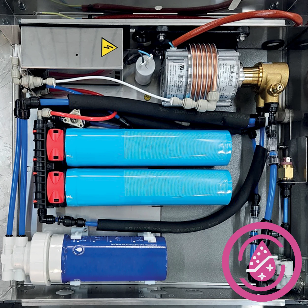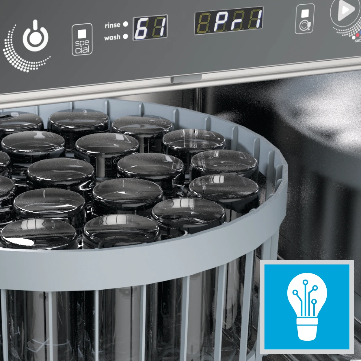 WaterMaster (Mašine za pranje čaša sa integrisanim sistemom reverzne osmoze)Nove mašine za pranje čaša sa integrisanim reverznim sistemom osmoze omogućavaju jednostavnu kontrolu svih radnih parametara direktno preko korisničkog interfejsa mašine.Rukovanje mašinom postaje veoma jednostavno, jer oba sistema omogućavaju centralno i jednostavno upravljanje – bez potrebe za bilo kakvim spoljnim kontrolerima.Zahvaljujući besprekornoj integraciji, korisnici imaju koristi od konstantno visokog kvaliteta vode koji obezbeđuje besprekorno čiste čaše bez tragova – bez potrebe za ručnim poliranjem.Funkcija automatskog praćenja kontinuirano proverava performanse sistema, garantujući pouzdan i efikasan rad u svakodnevoj upotrebi.Još jedna prednost je ugrađeni kertridž pretfiltera, koji ne samo da poboljšava kvalitet vode već i smanjuje potrebe za održavanjem. Pošto nije potrebna spoljna jedinica filtera, štedi se dragoceni prostor – idealno za kafiće i ugostiteljske objekte.Sa ovim dizajnom koji štedi prostor i inteligentnom integracijom sistema, kupci uživaju u nižim operativnim troškovima, maksimalnoj higijeni i konstantno briljantnim rezultatima – uz minimalan napor.