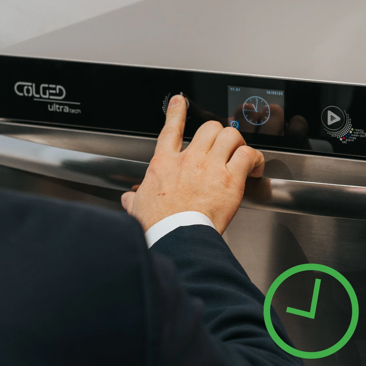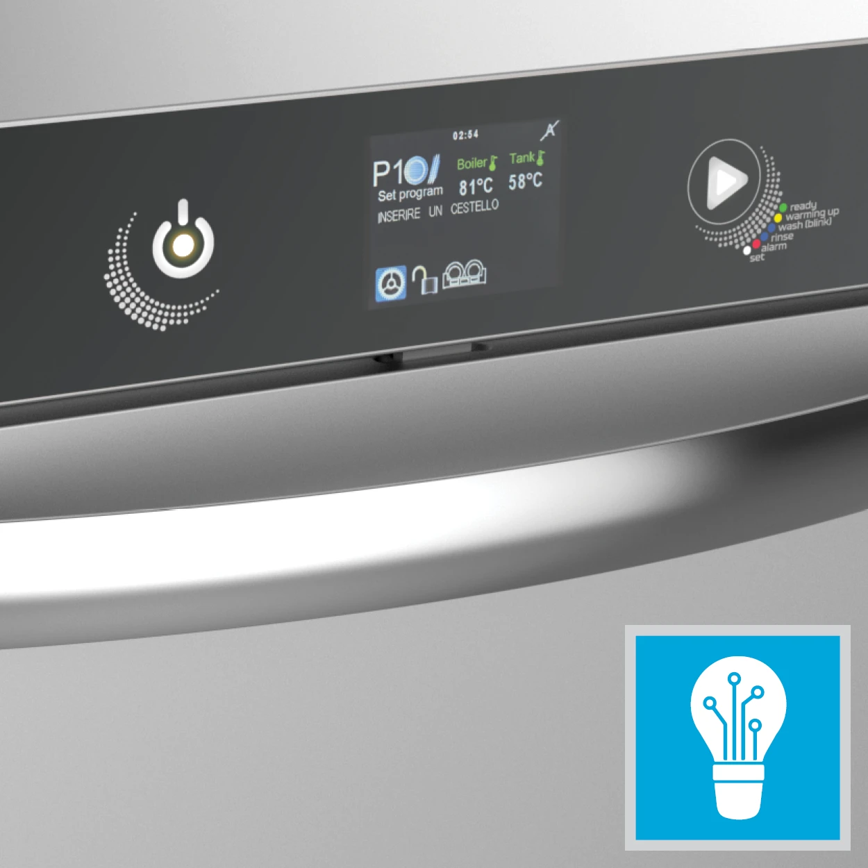 ProTouch korisnički interfejs kombinuje jednostavno rukovanje i inovativnu tehnologiju, čineći proces pranja efikasnijim i jednostavnijim za korisnika. Dva velika LED ekrana sa belim pozadinskim osvetljenjem segmentnih indikatora obezbeđuju jasnu vidljivost temperatura i sistemskih poruka.Kontrolna tabla ima četiri tastera koji funkcionišu na dodir za direktan pristup osnovnim funkcijama, dok ojačana, na grebanje otporna prednja ploča od sintetičkog stakla kombinuje izdržljivost sa elegantnim, modernim dizajnom. Ključna karakteristika je prednja ploča od sintetičkog stakla debljine 2 mm, otporna na grebanje, dizajnirana da pruži dugotrajne performanse i elegantan izgled mašine.