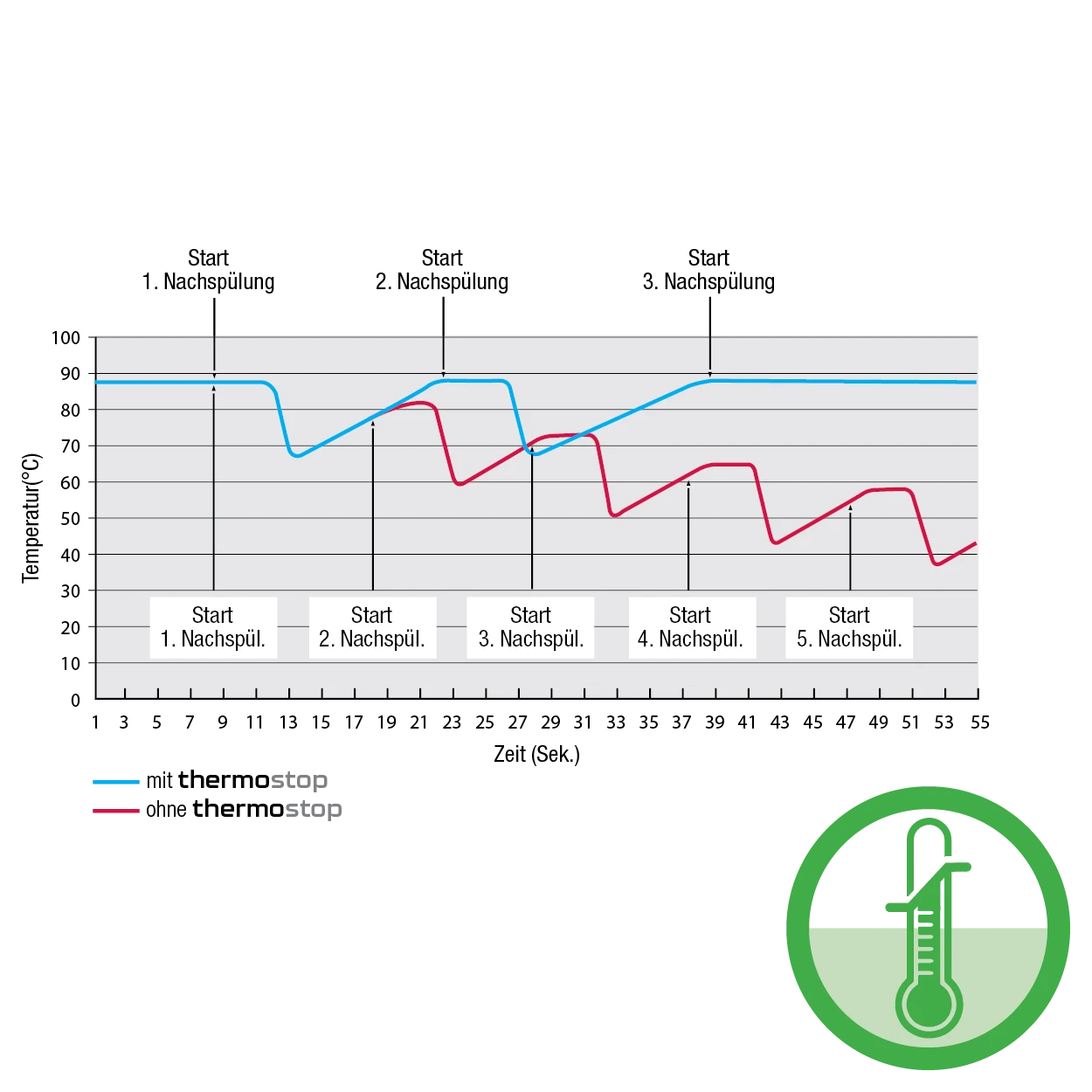TermoStop (sistem za kontrolu temperature)Funkcija TermoStop obezbeđuje konstantnu temperaturu bojlera za maksimalnu higijensku zaštitu.Ako temperatura padne ispod unapred podešene vrednosti, ciklus ispiranja se automatski produžava dok se ne postigne optimalna završna temperatura ispiranja.